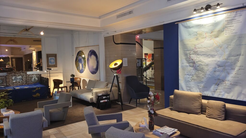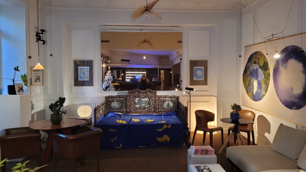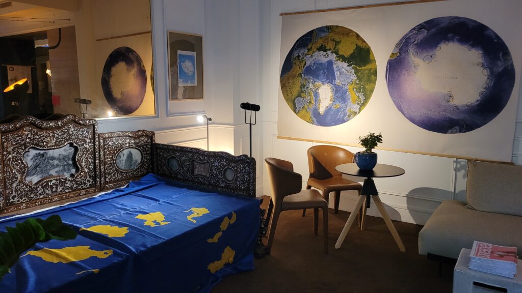 Selon l’artiste, la scénographie géographique est une extrapolation, un point de vue sur une position qui a cette particularité d’être en mouvement.